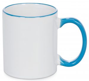 Biely hrnček s farebným lemom a uchom. Určený na potlač sublimáciou.