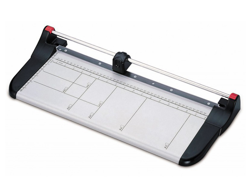 Robustná kotúčová rezačka A4 s brúseným rezným kolečkom a oceľovou reznou hlavou.
