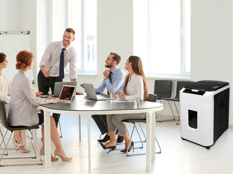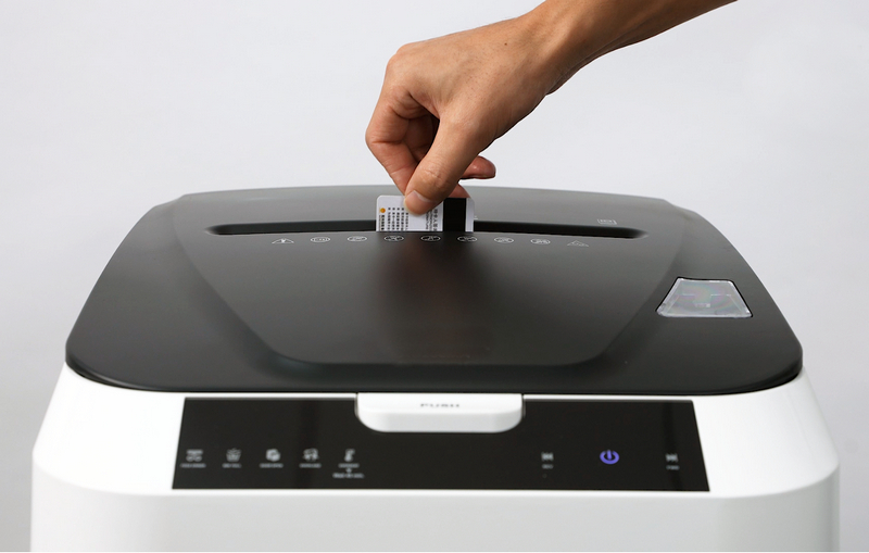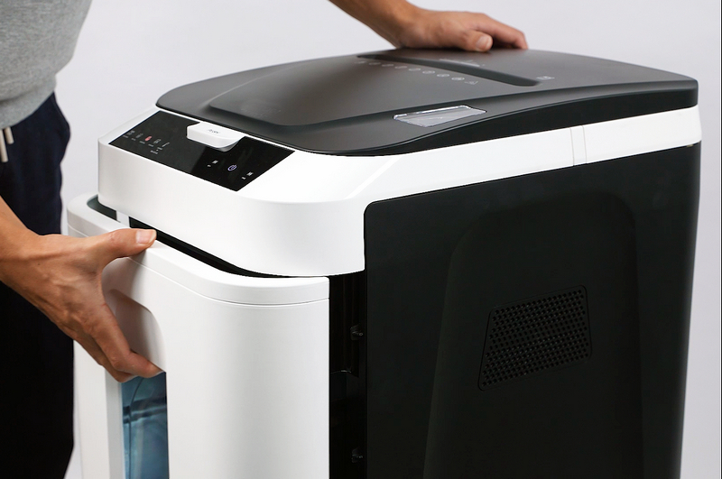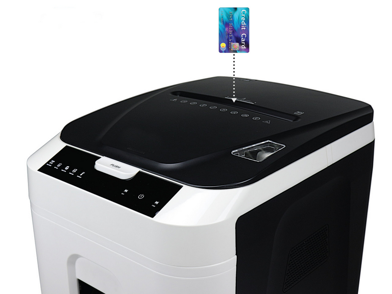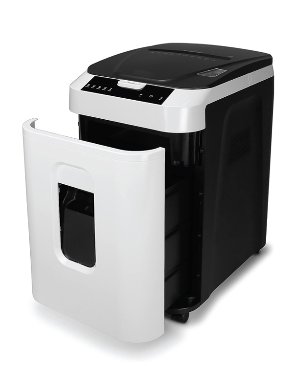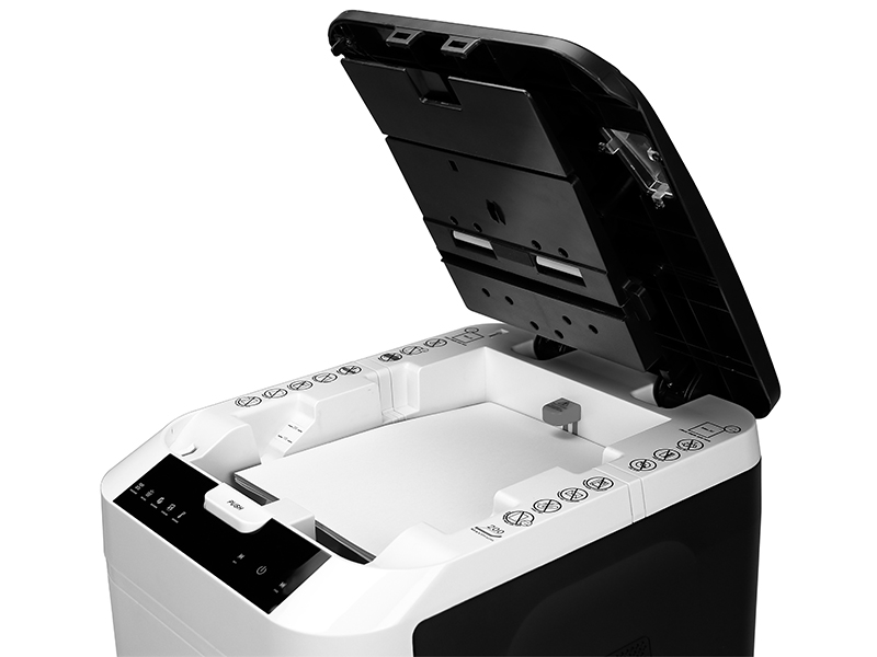 Skartovač pracuje sám a spracuje celý objem zásobníka. Nový podávací mechanizmus si poradí aj so zaprášenými papiermi alebo občasne zošitými sponkou.