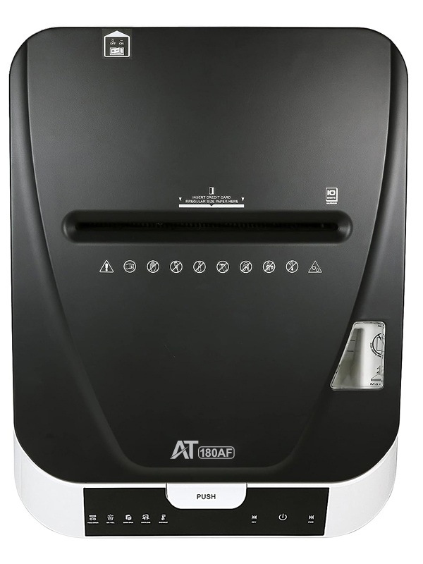 AT-180AF je skartovací stroj s automatickým podávačom v elegantnom dvojfarebnom prevedení. Stroj je vybavený priečnym rezom o veľkosti 2 x 12 mm. Objem zásobníka má poctivých 180 listov papiera A4 (70g/m2). Maximálna doba nepretržitej skartácie je 60 minút. Odpadová nádoba má objem 32,2 litrov. AT-180AF je vybavená výsuvným košom pre jednoduchšiu manipuláciu. Zapnutie alebo prehriatie prístroja indikuje LED kontrolka.